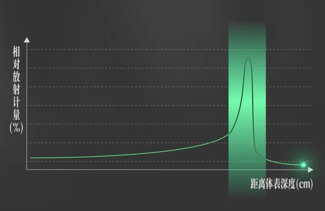 由于能量只在很小的区域内集中爆发,导致相对放射剂量如山峰般拔地而起,所以这种现象又被叫做 “布拉格峰”。