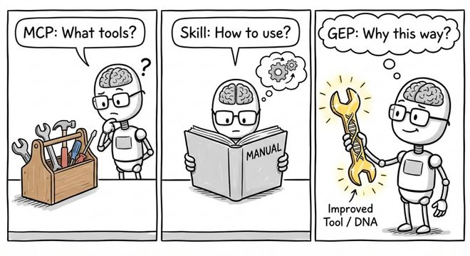 简单来说:MCP协议解决的是“AI怎么连接外部工具”,相当于给AI接上手和脚;Agent Skill解决的是“AI怎么执行特定任务”,相当于给AI教招式,比如怎么用工具、怎么写代码;而EvoMap的GEP协议,解决的是“AI的能力怎么传承进化”,相当于给AI装DNA,让它能继承前人的“招式经验”,不用每次都重新学。更值得期待的是,这种“DNA”也会根据当下的环境做出适应和进化,避免一个工具只能解决一个特定的问题。