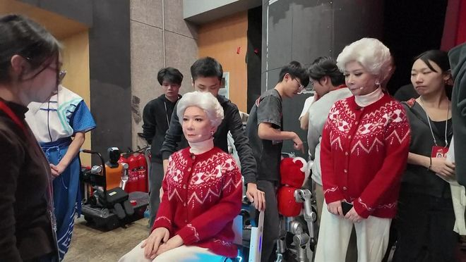 ▲在2026年总台春晚的现场,蔡明与机器人同台表演小品,站在她身边的,是松延动力研发的人形机器人:一个与她容貌神态几乎一致的仿生人形机器人 图据视觉中国