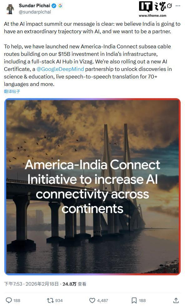 这一计划是谷歌此前承诺的五年 150 亿美元(IT之家注:现汇率约合 1037.34 亿元人民币)印度 AI 基础设施投资的重要组成部分,旨在通过新建数字基础设施与技能培训倡议,提升印度及全球范围内的网络连接性,并以此缩小“数字鸿沟”向“AI 鸿沟”转化的风险。
