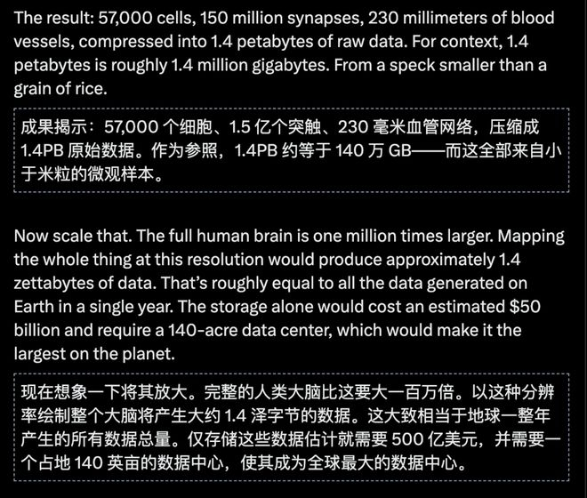 「哈佛和谷歌耗尽资源,花了十年时间,才勉强绘制出1立方毫米、比米粒还小的人脑图谱。这背后的数学复杂度和能效比,足以让地球上所有的AI实验室集体汗颜。」