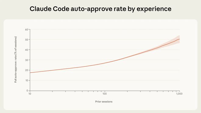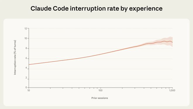 相比之下,新用户(使用次数少于 50 次)仅在约 20% 的会话中启用“全自动模式”,而当使用次数达到 750 次以上时,该比例上升至 40% 以上。与此同时,用户中途打断模型执行的比例也从约 5% 上升至约 9%。