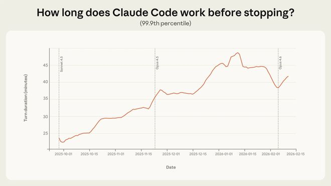 在 2025 年 10 月至 2026 年 1 月期间,其“turn duration”(即从模型开始执行任务到停止的时间)第 99.9 百分位的运行时长从不足 25 分钟上升至超过 45 分钟。相比之下,中位数时长维持在约 45 秒,且过去数月波动有限。