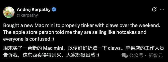 他在社交媒体上发帖:自己周末买了一台新Mac mini,准备好好折腾一番「Claws」。