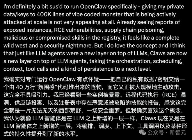 狂欢背后,OpenClaw正面临着严峻的安全考验。Karpathy在兴奋之余也坦言了自己的极度不安: