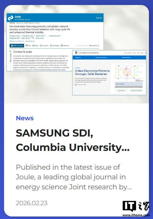 IT之家 2 月 23 日消息,三星 SDI 今日官宣,三星 SDI 韩国研发中心、SDI 美国研发中心(SDIRA)和哥伦比亚大学联合研究,发现提升锂金属电池寿命和安全性的方法,推动下一代电池商业化进程。