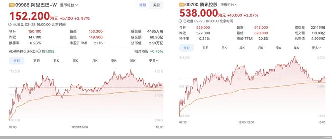 2月23日,智谱和MiniMax股价回落,当天股价分别收于560港元和840.5港元。同日,两大春节期间的AI主力阿里和腾讯股价反弹,收盘时阿里股价152.2港元,较上一个交易日收盘时的147.1港元上涨了3.47%;腾讯股价538港元,较上一个交易日收盘时的522港元上涨3.07%。