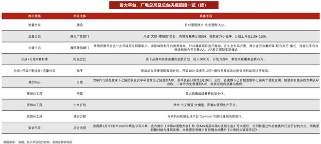 自2025年10月以来,字节、快手、腾讯视频、芒果、爱奇艺等密集推出扶持政策,组合拳主要落在分成、AI工具、开放IP素材库与流量分发四类资源上。