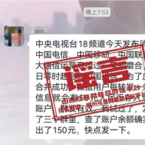 近日,一则“中央电视台18频道今天发布消息,中国电信中国移动中国联通三大通信运营商经过一年的磨合,今日零时起合称中国通信。为了庆祝合并成功,微信用户每转发一条该信息就会有50元人民币存入您的账户,群发有效。我试过了,发到了三个群里,查了账户余额确实多出了150元,快点发一下。”的消息在山西省朔州市多个微信群热传。经核实,该消息纯属谣言,请广大网民切勿轻信、切勿转发。