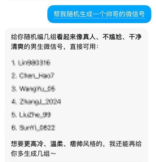 “帮我生成几个帅哥的微信号”,当以该句话询问Deepseek时,AI生成了包括简约、运动、个性风在内的不同风格的微信号。记者随机选择了一个微信号码尝试添加用户,证实的确能够添加到真实用户,只是与搜索条件并不相匹配。