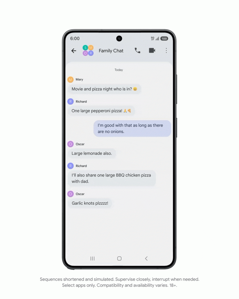 比如,当用户和朋友聊到聚会要订披萨,用户可以直接叫出 Gemini,吩咐一句「弄清楚订单」,Gemini 就能直接抓取聊天中提到的披萨店,甚至特定的披萨种类,整理好每个人的需求。