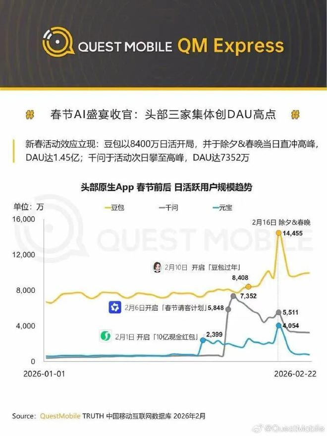 QuestMobile数据显示,千问“春节请客计划”活动首日即吸引1475万用户参与,次日参与人数接近2000万,占当日APP活跃用户的26.8%。QuestMobile还总结表示:“春节活动效应立现:豆包以8400万日活开局,并于除夕&春晚当日直冲高峰,DAU达1.45亿;千问于活动次日攀至高峰,DAU达7352万。