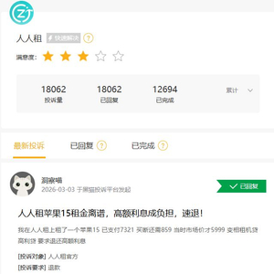 如仅黑猫投诉平台,人人租的累计投诉量就高达18000条。最新针对人人租的投诉显示,客户在人人租上租了一个苹果15,已支付7321,买断还需859,当时市场价才5999 ,变相租机贷、高利贷。
