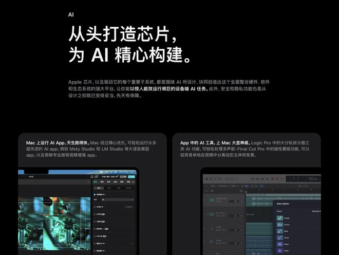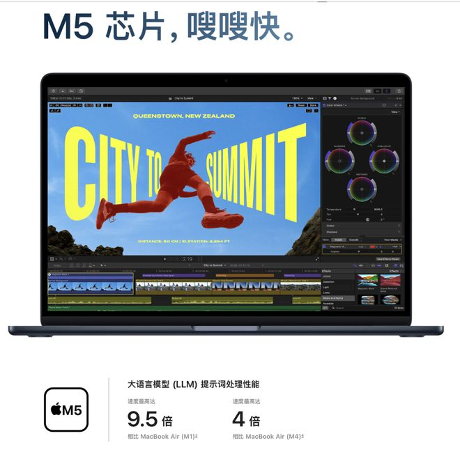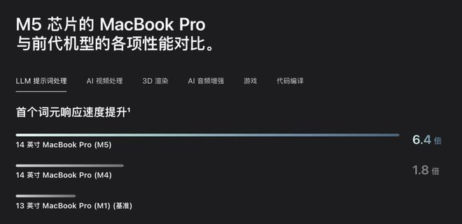 以前苹果卖 Mac,喜欢放几条对比柱状图,告诉你“用 Final Cut Pro 导出 8K 视频比上代快了百分之多少”、“用 Logic Pro 能开多少条音频轨道”。但到了 M5 这一代,这些创作者的传统手艺全被挤到了角落里。