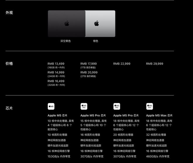 MacBook Pro 这次还是用 M5、M5 Pro 和 M5 Max 三款芯片区分版本,版本之间泾渭分明、价差极大。