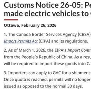 此外,加拿大边境服务局2月26日发布的海关通知显示,所有从中国进口车辆除需获得进口许可外,还必须符合加拿大全部安全法规要求。