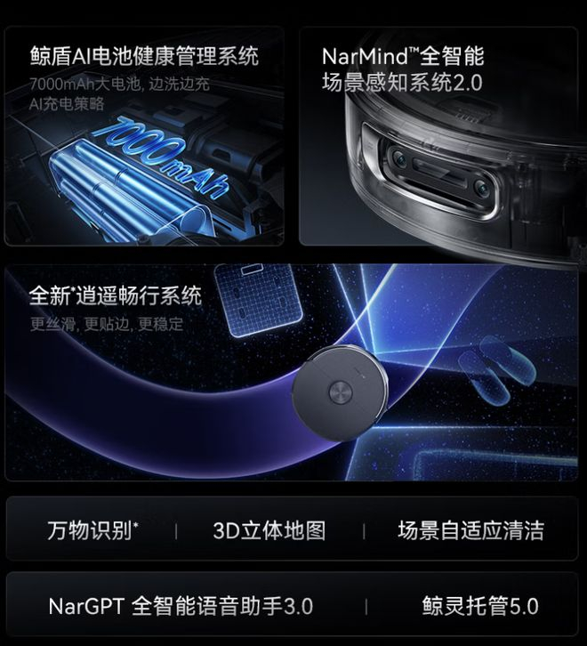 在续航方面,云鲸逍遥 003 升级鲸盾 AI 电池健康管理系统,配备 7000mAh 大容量电池,搭载极速闪充技术,支持 AI 数据监控,智配最优充电策略。