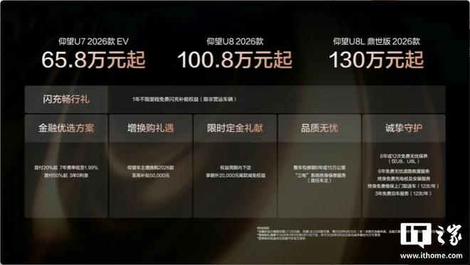 IT之家注意到,仰望 U8L 也迎来了 2026 款,同样增加续航,新增闪充,还提供三大安全升级:应急浮水紧急自动激活、NOA 爆胎稳行稳停、全场景隐私安全,老款车型后续也能通过 OTA 获得这些功能。
