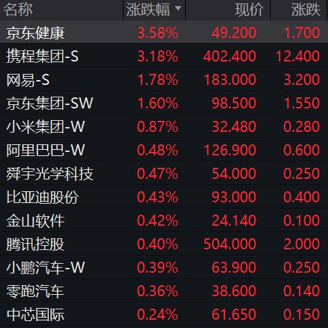 科网股多数上涨,京东健康、携程集团涨逾3%,网易、京东集团涨逾1%,小米集团、阿里巴巴、比亚迪股份、腾讯控股等涨幅靠前。