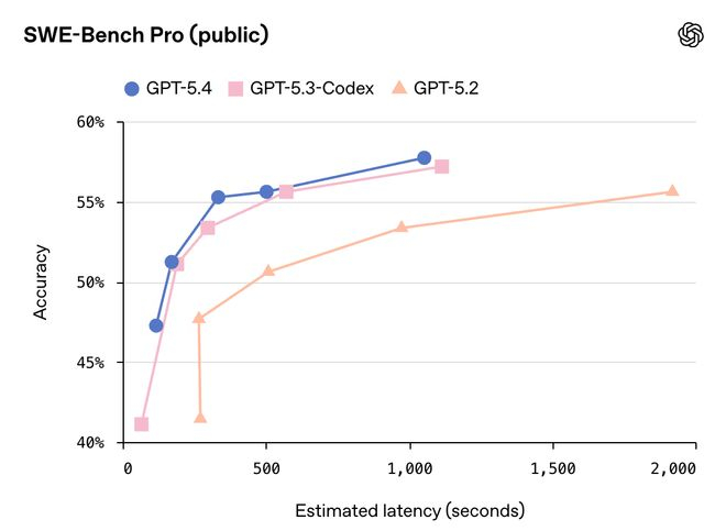 在SWE‑Bench Pro测试中,GPT‑5.4的表现持平甚至超越GPT‑5.3‑Codex,同时在各类推理任务中延迟更低。