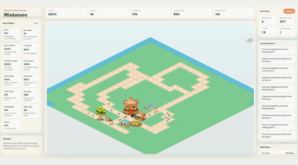 ▲一款仅通过简短提示词、由GPT‑5.4生成的主题公园模拟游戏, 开发过程中使用 Playwright Interactive 进行浏览器端实机测试,并通过图像生成创建等距视角美术资源。