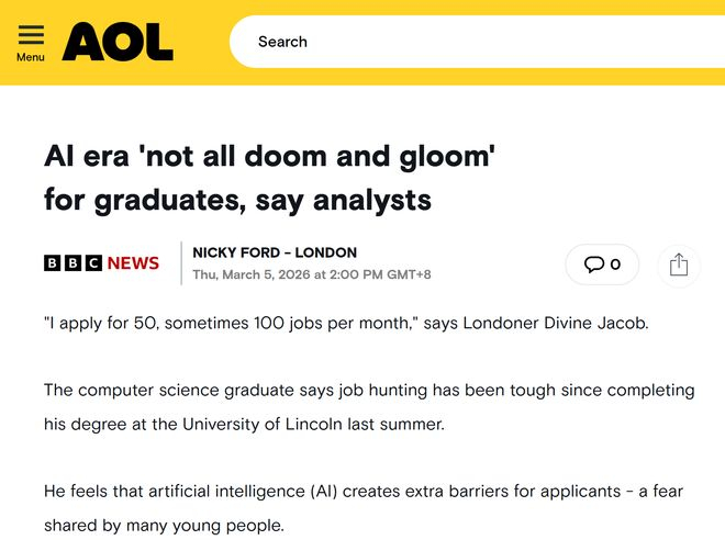 【环球网科技综合报道】3月6日消息,据AOL报道,知名咨询公司麦肯锡最新分析指出,人工智能时代下毕业生的就业前景并非全然悲观,尽管部分行业受AI影响出现招聘收缩,但善于驾驭AI工具的人才正成为就业市场的青睐对象,企业也愈发重视培养员工的AI工具应用与管理能力。