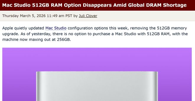 【环球网科技综合报道】3月6日消息,据MacRumors报道,苹果近日对Mac Studio电脑的配置选项进行调整,悄然移除了512GB内存版本,同时256GB内存顶配版本的发货时间排至5月,相关高配版本的升级价格也出现上调。
