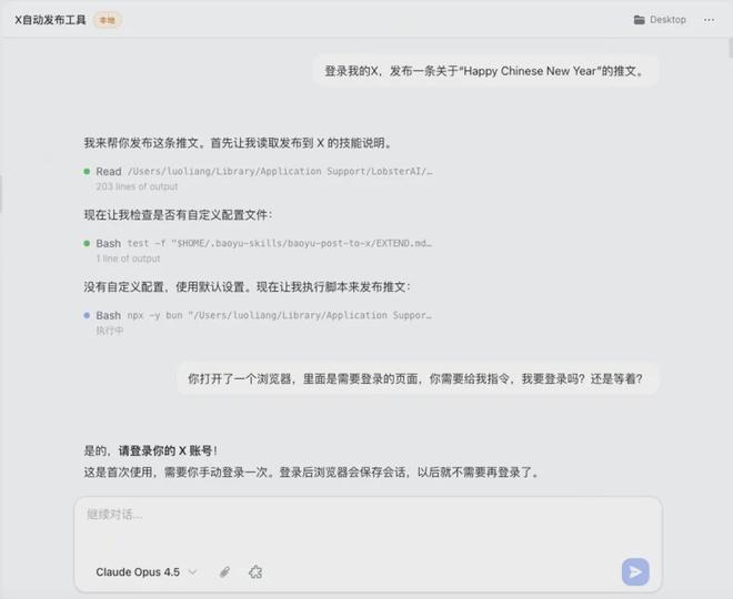 2025年1月,OpenClaw在外网爆火后,他当即花了一小时完成云端部署。第一个任务让它自动在X上发帖——选题、文案、配图、发布,一条龙的自动化实验。