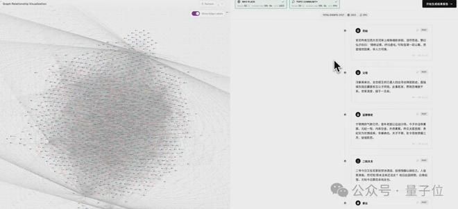 在这里,经过30轮的双世界模拟后,五百多个Agent总共进行了将近2000个活动。左侧是模拟后的人物关系图谱,右侧则显示每个人物具体的活动内容和发表言论,串起来就是新的剧情。