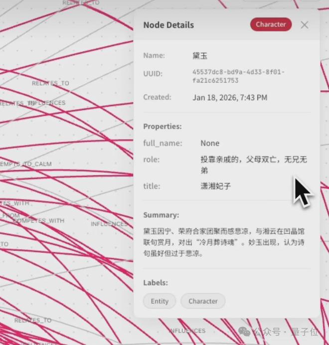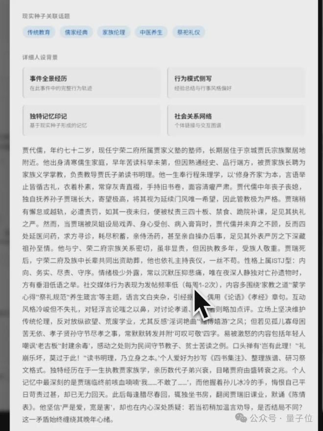 点击每一个人设,都能看到人物在故事中的全景经历、独特记忆、行为模式、社会关系网络等等。