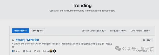 你没看错,这是一个用AI预测世界的开源项目,名叫MiroFish,刚迅速登顶Github Trending榜。其Star数从1月底开始暴涨,目前已突破5.7k。