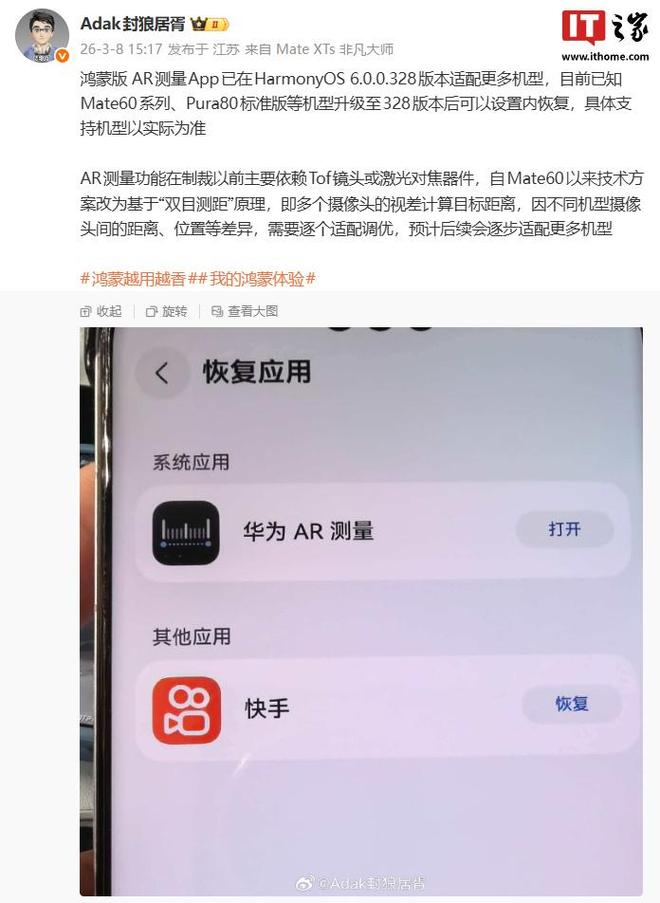 IT之家 3 月 8 日消息,目前,华为 AR 测量已在更多升级至鸿蒙 HarmonyOS 6 系统的机型回归,更新 HarmonyOS 6.0.0.328 版本的设备,如 Mate 60 系列,可在“设置 → 应用和元服务 → 恢复应用”中找到并恢复“华为 AR 测量”可用。