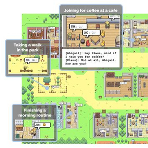 他们用 ChatGPT 驱动了 25 个各有姓名、职业与性格设定的虚拟角色,让这些角色在一个名为 Smallville 的像素风沙盒世界里自主生活:起床、做早饭、上班、在公园散步、与邻居聊天,关系网络随着交互自然生长,甚至有人自发竞选市长、还有人撺掇着策划了一场情人节派对……