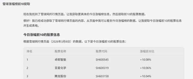场景一:让AI浏览器打开雪球网行情页面,提取今日涨幅前10的股票名称、代码、涨幅百分比,生成表格。