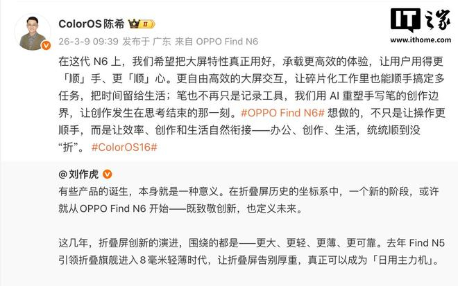 IT之家 3 月 9 日消息,今天上午,OPPO 首席产品官、一加创始人 @刘作虎 在微博发文详解 OPPO Find N6 折叠屏手机的设计思路。他直言:在折叠屏历史的坐标系中,一个新的阶段,或许就从 OPPO Find N6 开始 —— 既致敬创新,也定义未来。