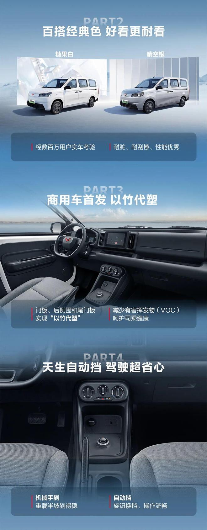设计方面,五菱荣光纯电版通过 7 处风阻优化,实现了 0.304Cd 的风阻系数,累计降低风阻 12%。新车采用商用车首发的“以竹代塑”竹纤维复合材料内饰,能减少车内有害挥发物,提升用车体验。