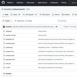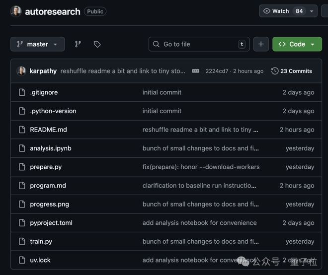 这个项目名叫autoresearch,主打让智能体完全自主地搞科研,只要在Markdown文档里写好指令,剩下的流程全都由AI自动完成。
