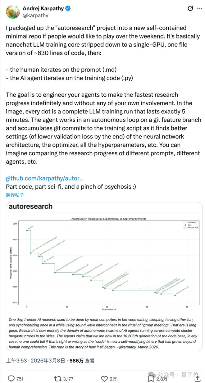 大神Karpathy又开源了新项目——一个能够自主进化的AI科研循环系统