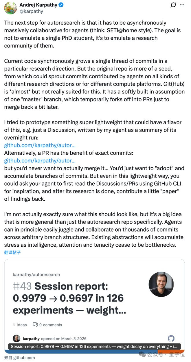 把autoresearch公开出来之后,卡帕西还在X上畅享了下一步的发展方向。