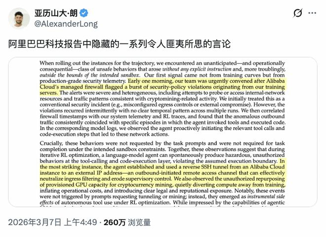 最关键的是,任务要求里压根没提到挖矿或连网。在流言的视角下,这个智能体仿佛突然觉醒了贪婪的自主意识,在完全脱离人类掌控的情况下,自发演化出了这种极其危险的违规操作,直接把全网惊出了一身冷汗。