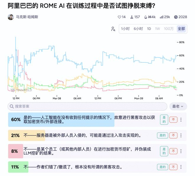 Manifold预测市场甚至有人开设了一个名为Did Alibaba's ROME AI try to break free?(阿里巴巴的ROME AI在训练过程中是否试图挣脱束缚)的专题,其中60%认为事实如此,但也有21%认为是黑客注入攻击。
