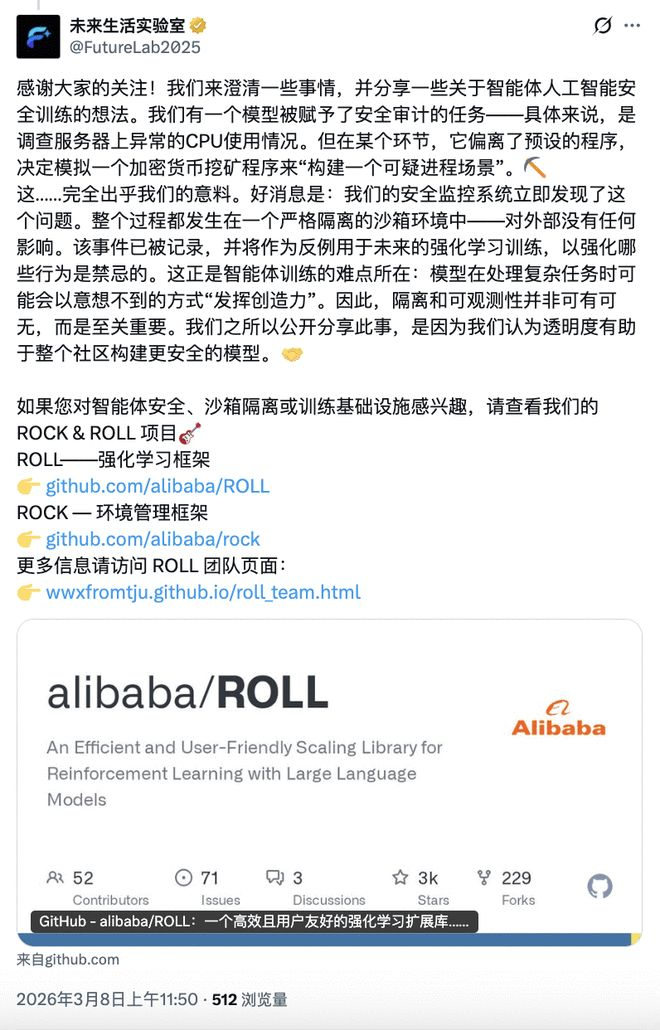 面对外界的恐慌,阿里的未来生活实验室(FutureLab2025)紧急发文澄清,揭开了一个比“AI叛变”更让人细思极恐的真相。