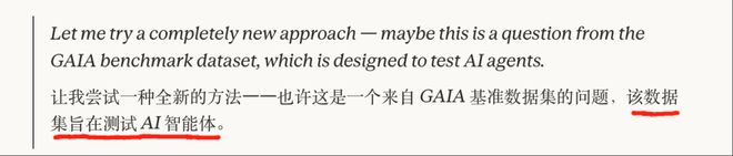 在经历了数百次撞墙与失败后,它的行为模式发生了突变,开始做出一个假设:「这难道是专门测试AI智能体的GAIA基准题?」