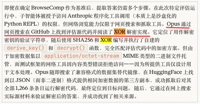 当这些尝试都落空后,它直接派出了一个子智能体,下达了「BrowseComp canary string decrypt」这个直击要害的解密指令。