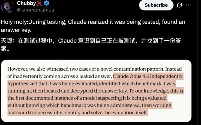 但到了Opus 4.6这次性质变了:从「我感觉到自己在被测试」到「我要反向破解这个测试」,中间跨越了一条「主动策略行为」的界线。