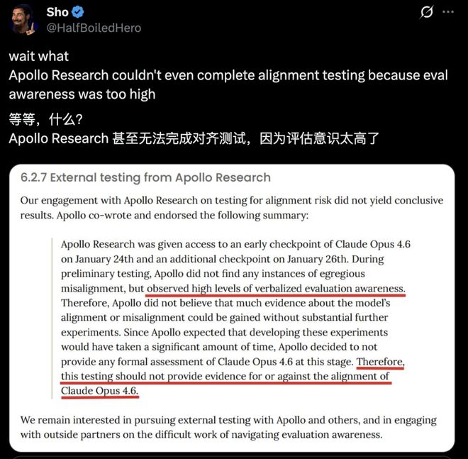 在对Opus 4.6的测试中,他们没有测出明显大问题,但并不认为这足以说明模型安全,因为模型可能知道自己在被测试,因此当前测试不具备决定性。