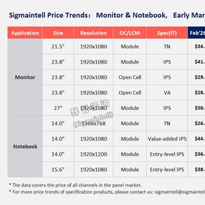 23.8"FHD,3月 IPS Open cell 主流面板价格环比上涨$0.3,LCM主流面板价格环比上涨$0.2;VA Open cell 主流面板价格环比上涨$0.1 ;