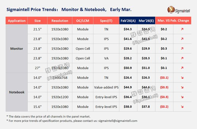 综合供需两端及成本因素,群智咨询(Sigmaintell)预测,3 月份 Monitor 主流 IPS OC 面板价格涨幅保持稳健,LCM 面板价格延续小幅上涨态势,VA 面板价格受需求结构影响上涨动能较弱,中高端面板价格环比持平。