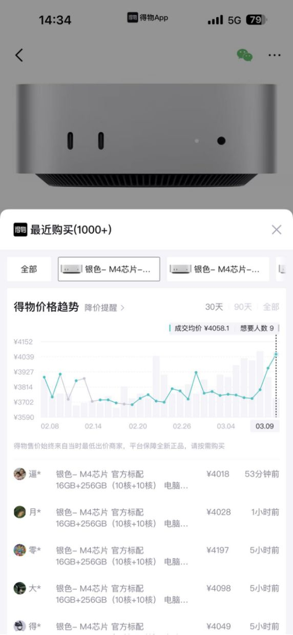 同时本地化部署带动了主机的销量激增,“龙虾热”带火苹果Mac Mini M4,近一周价格逆势增长近650元一机难求,引发消费者抢购潮,产品在官网等渠道已售罄。得物App数据显示,Mac Mini M4 16GB+512GB版本最新成交价由4950上涨至5599元,价格上涨649元(13%);Mac Mini M4 16GB+256GB版本最新成交价由3751元上涨至4058元,价格上涨307元(8%);配置更高的Mac Mini M4 Pro 24GB+1TB版本最新成交价为9999元,近1个月价格上涨了1900元(23%)。