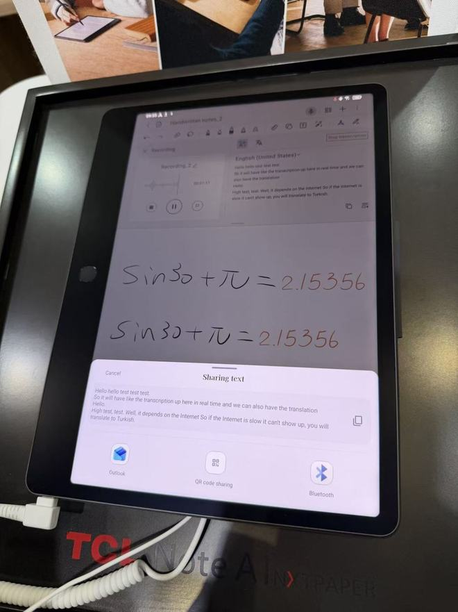 TCL则带来了一款非常有创新的笔记本Note A1(NXTPAPER),有类似纸的书写体验,并且引入了AI功能,可以手写计算、圈选搜索,语音转录成文字等等。